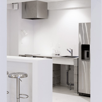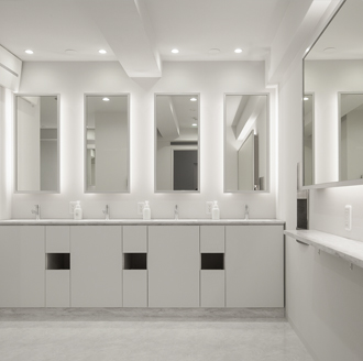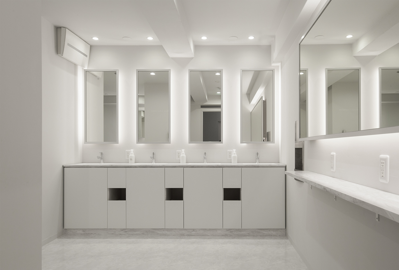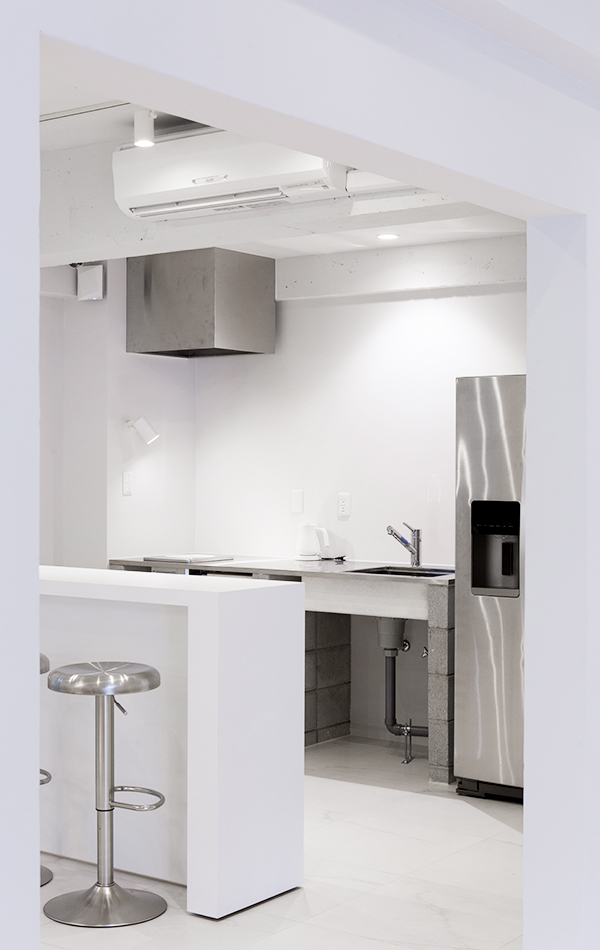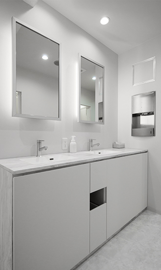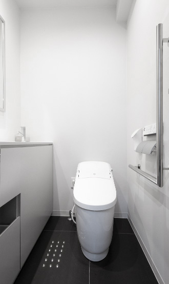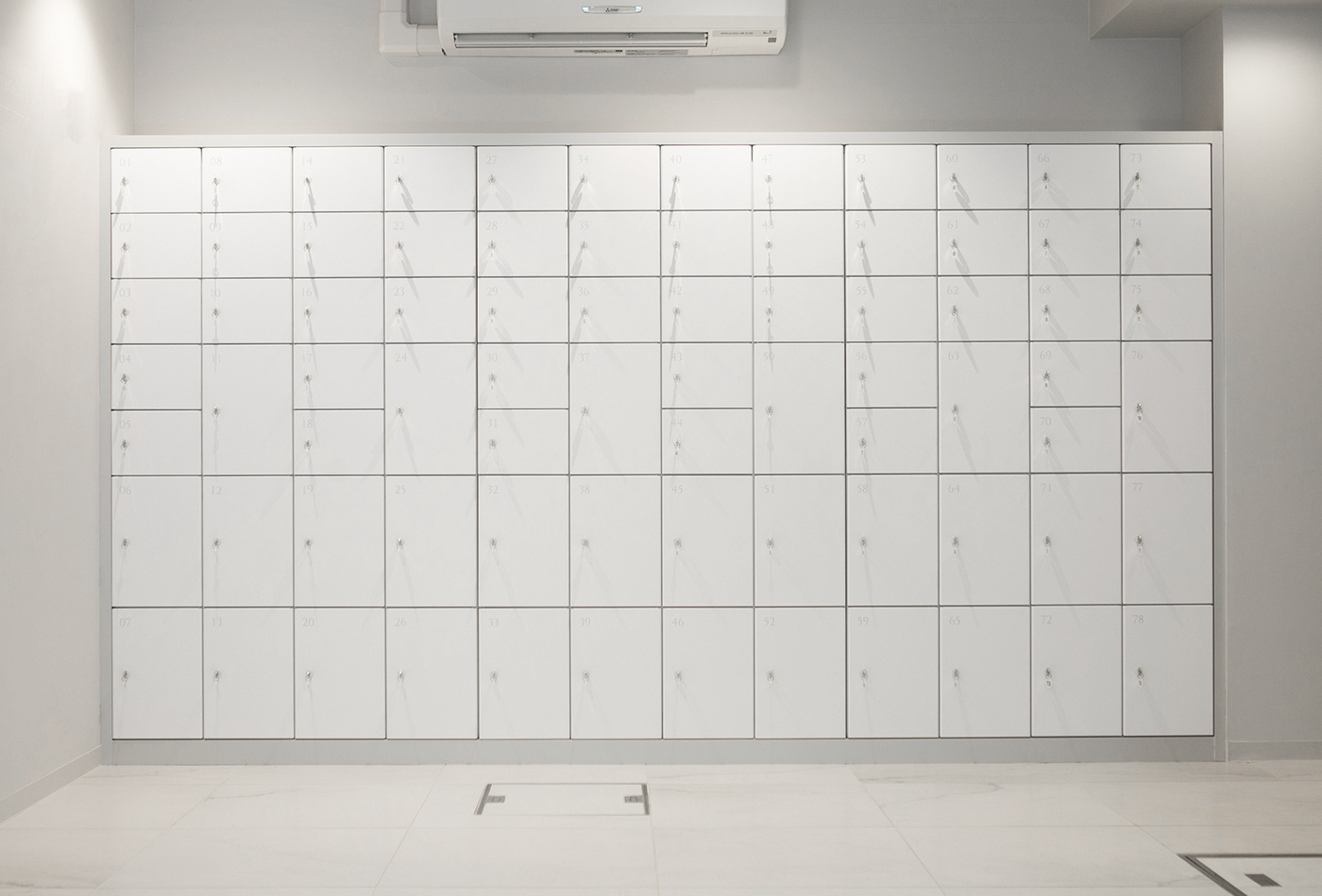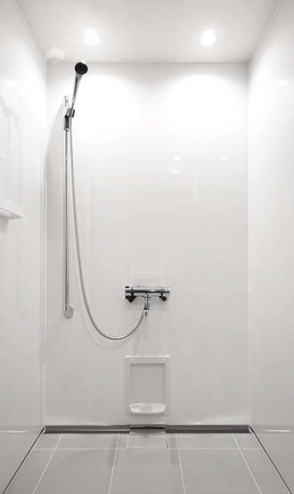 宿泊者で仲良くシェアする共用部分、たとえばシャワールーム、トイレ、ランドリーなどは、どなたが使っても清潔と快適を保てるしつらえに。床や壁はフラットな表面なので、自分でちょこっとお掃除するのに便利です。