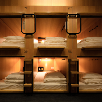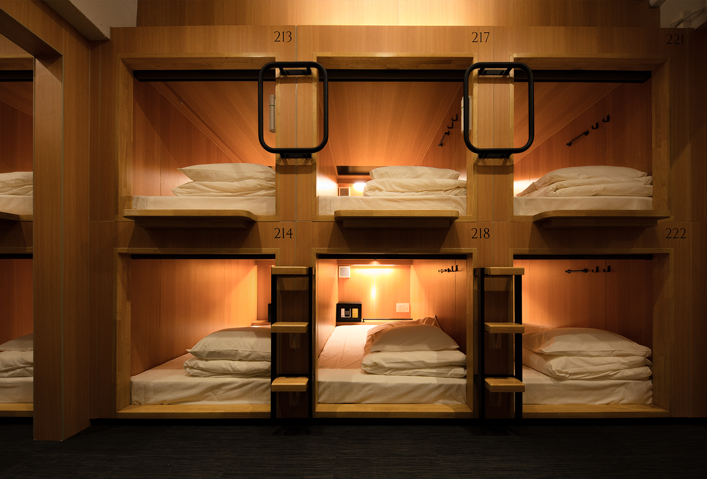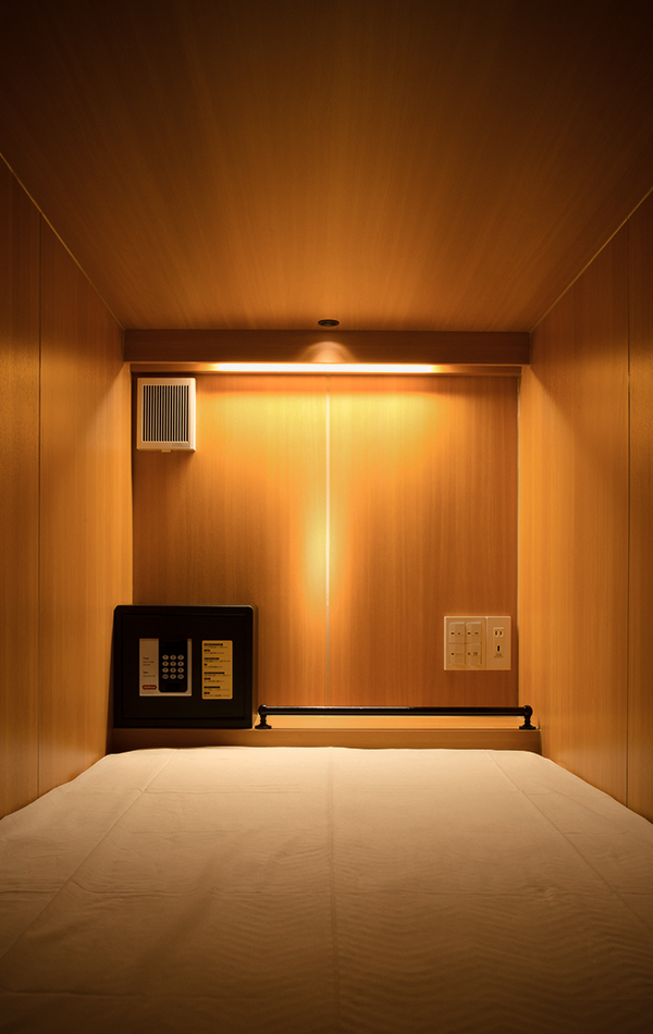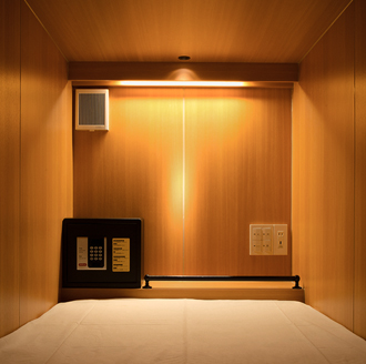 カプセルタイプのTSUKIMI HOTEL(つきみホテル)は、眠る場所だけプライベートな個室。すっと眠りに落ちていけるよう、客室はあたたかな木の空間にしています。